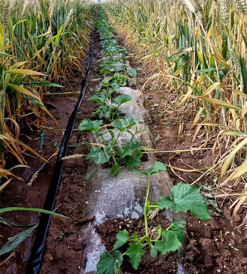 我們這里是從四月中旬開始麥茬套種甜瓜,為了讓甜瓜盡早上市,賣上好價(jià)錢,就在麥子收獲前定植。行距為1.9米、株距1米,甜瓜苗在未成熟的麥田中生長(zhǎng),寬行距有利于通風(fēng),以利瓜苗快速生長(zhǎng)。